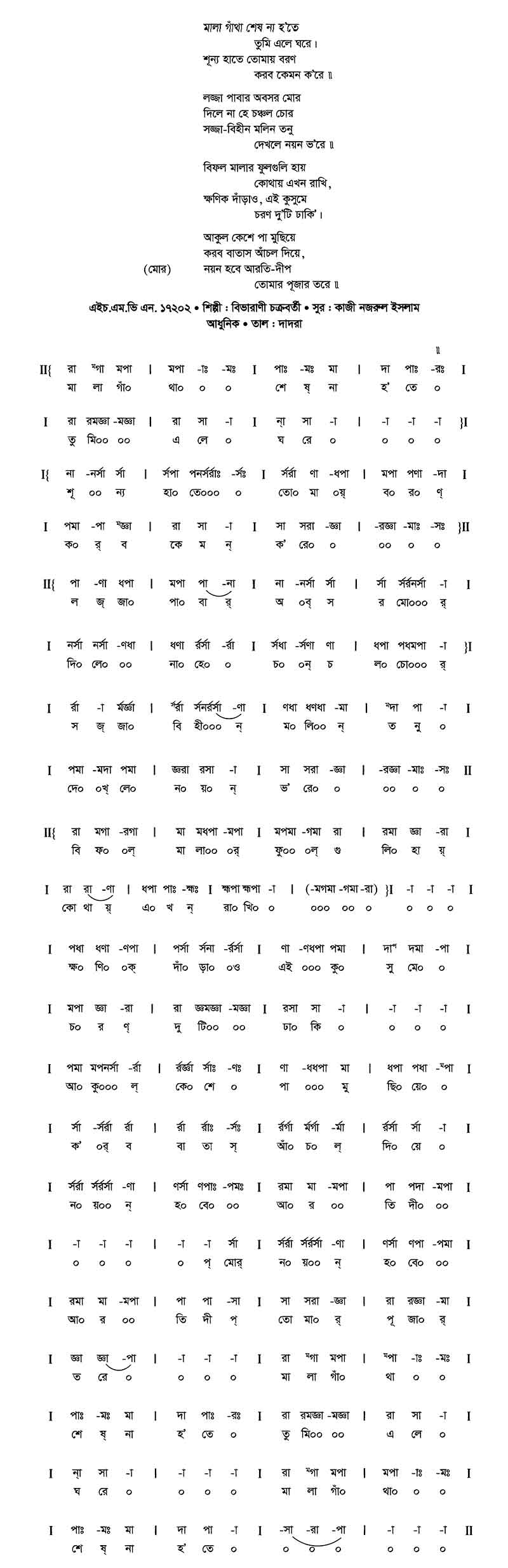 মালা গাঁথা শেষ না হ’তে তুমি এলে ঘরে। শূন্য হাতে তোমায় বরণ করব কেমন ক’রে।। লজ্জা পাবার অবসর মোর দিলে না হে চঞ্চল, চোর সজ্জা-বিহীন মলিন তনু দেখলে নয়ন ভ’রে।। বিফল মালার ফুলগুলি হায় কোথায় এখন রাখি, ক্ষণিক দাঁড়াও, ঐ কুসুমে (তোমার) চরণ দু’টি ঢাকি। আকুল কেশে পা মুছিয়ে করব বাতাস আঁচল দিয়ে, (মোর) নয়ন হবে আরতি-দীপ তোমার পূজার তরে।।