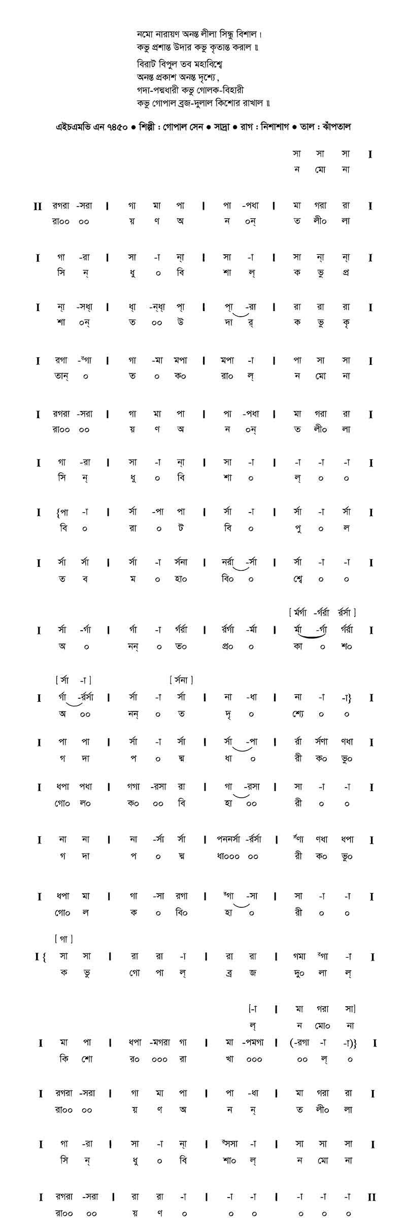 নমো নারায়ণ অনন্ত লীলা সিন্ধু বিশাল। কভু প্রশান্ত উদার কভু কৃতান্ত করাল।। বিরাট বিপুল তব মহা বিশ্বে, অনন্ত প্রকাশ অনন্ত দৃশ্যে, গদা-পদ্মধারী কভু গোলক-বিহারী কভু গোপাল ব্রজ-দুলাল কিশোর রাখাল।।