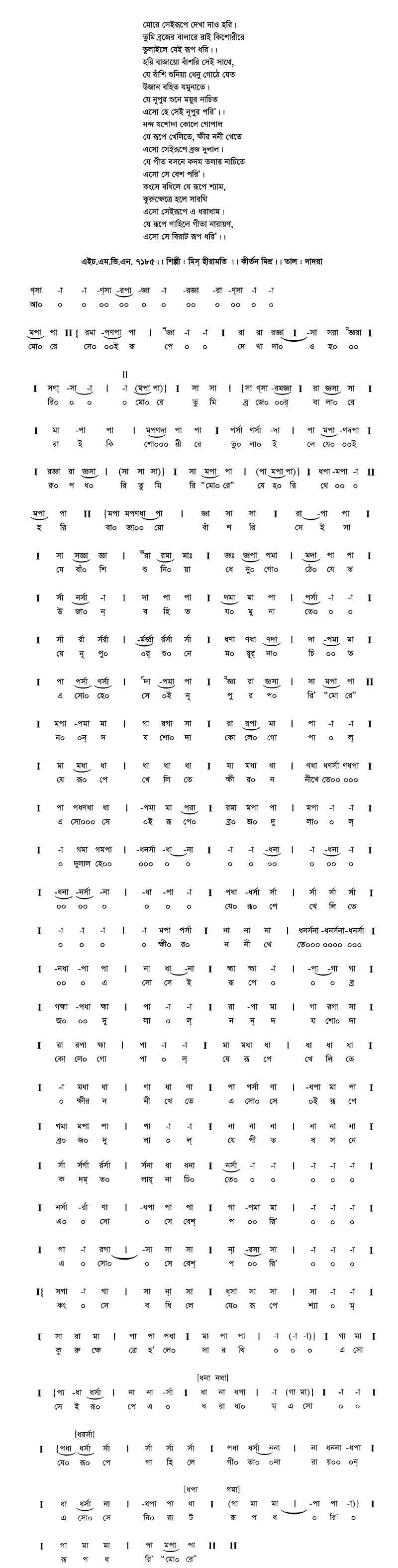 মোরে সেইরূপে দেখা দাও হরি। তুমি ব্রজের বালারে রাই কিশোরীরে ভুলাইলে যেই রূপ ধরি’।। হরি বাজায়ো বাঁশরি সেই সাথে, যে বাঁশি শুনিয়া ধেনু গোঠে যেত উজান বহিত যমুনাতে। যে নূপুর শুনে ময়ূর নাচিত এসো হে সেই নূপুর পরি।। নন্দ যশোদা কোলে গোপাল যে রূপে খেলিতে, ক্ষীর ননী খেতে এসো সেই রূপে ব্রজ দুলাল। যে পীত বসনে কদম তলায় নাচিতে এসো সে বেশ পরি।। কংসে বধিলে যে রূপে শ্যাম, কুরুক্ষেত্রে হলে সারথি এসো সেইরূপে এ ধরাধাম। যে রূপে গাহিলে গীতা নারায়ণ, এসো সে বিরাট রূপ ধরি।।