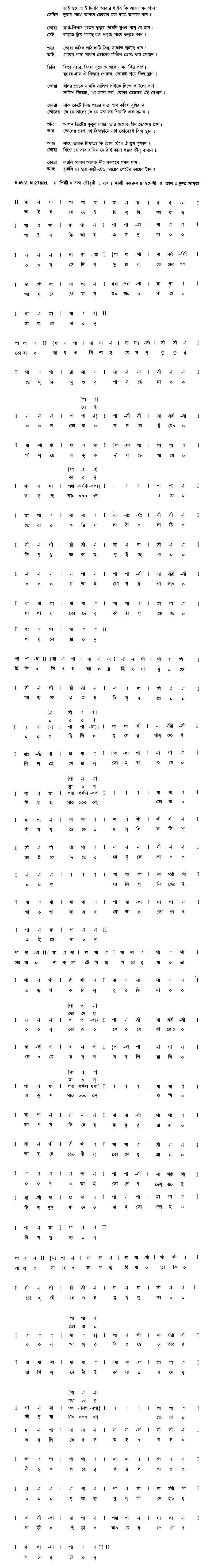 ভাই হয়ে ভাই চিনবি আবার গাইব কি আর এমন গান! সেদিন দুয়ার ভেঙে আসবে জোয়ার মরা গাঙে ডাকবে বান।। তোরা স্বার্থ-পিশাচ যেমন কুকুর তেমনি মুগুর পাস রে মান। সেই কলজে চুঁয়ে গলছে রক্ত দলছে পায়ে ডলছে কান।। ওরে তোরা করিস লাঠালাঠি সিন্ধু-ডাকাত লুটছে ধান! তাই গোবর-গাদা মাথায় তোদের কাঁঠাল ভেঙে খায় শেয়ান।। ছিলি সিংহ ব্যাঘ্র, হিংসা-যুদ্ধে আজকে এমন ক্ষিন্ন প্রাণ। মুখের গ্রাস ঐ গিলছে শেয়াল, তোমরা শুয়ে নিচ্ছ ঘ্রাণ।। তোরা বাঁদর ডেকে মানলি সালিশ ভাইকে দিতে ফাটলো প্রাণ! সালিশ নিজেই, ‘খা ডালা সব’, বোকা তোদের এই দেখান।। তোরা নাক কেটে নিজ পরের যাত্রা ভঙ্গ করিস বুদ্ধিমান তোদের কে যে ভালো কে যে মন্দ সব শিয়ালই এক সমান।। শুনি আপন ভিটের কুকুর রাজা, তার চেয়েও হীন তোদের প্রাণ। তাই তোদের দেশ এই হিন্দুস্থানে নাই তোদেরই বিন্দু স্থান।। আজ সাধে ভারত-বিধাতা কি চোখ বেঁধে ঐ মুখ লুকান! তোরা বিশ্বে যে তার রাখিসনে ঠাঁই কানা গরুর ভীন বাথান।। তোরা করলি কেবল অহরহ নীচ কলহের পরল পান। আজ বুঝলি নে হায় নাড়ি-ছেড়া মায়ের পেটের ভায়ের টান।।