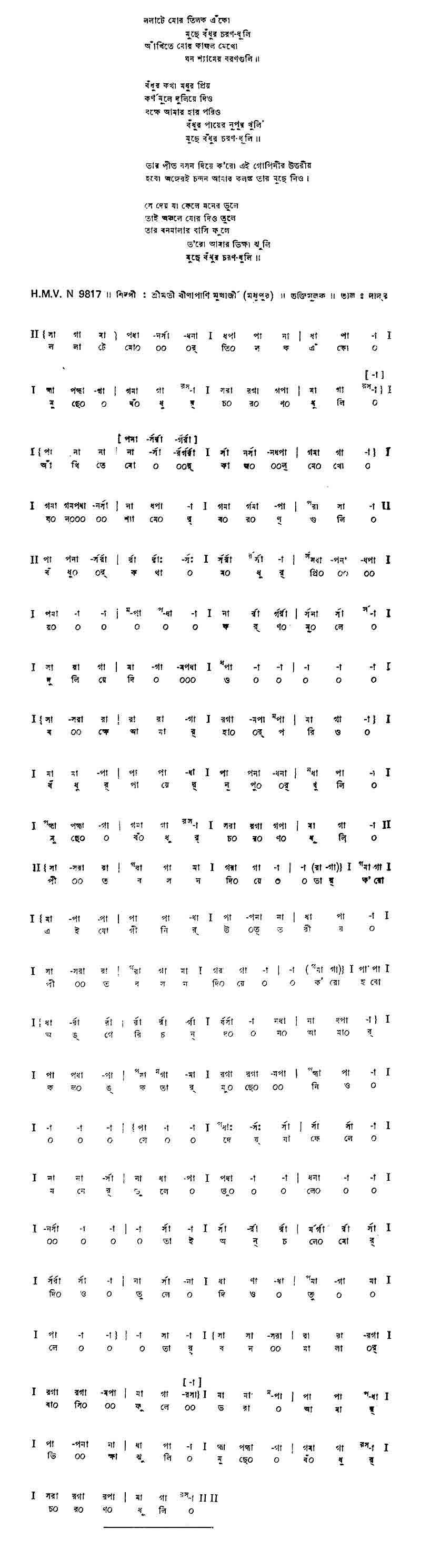 ললাটে মোর তিলক এঁকো মুছে বঁধুর চরণ-ধুলি আঁখিতে মোর কাজল মেখো ঘন শ্যামের বরণগুলি।। বঁধুর কথা মধুর প্রিয় কর্ণ মূলে দুলিয়ে দিও বক্ষে আমার হার পরিও বঁধুর পায়ের নূপুর খুলি।। তার পীত বসন দিয়ে ক'রো এই যোগিনীর উত্তরীয় হবে অঙ্গেরই চন্দন আমার কলঙ্ক তার মুছে নিও। সে দেয় যা ফেলে মনের ভুলে তাই অঞ্চলে মোর দিও তুলে তার বনমালার বাসি ফুলে ভ'রো আমার ভিক্ষা ঝুলি।।