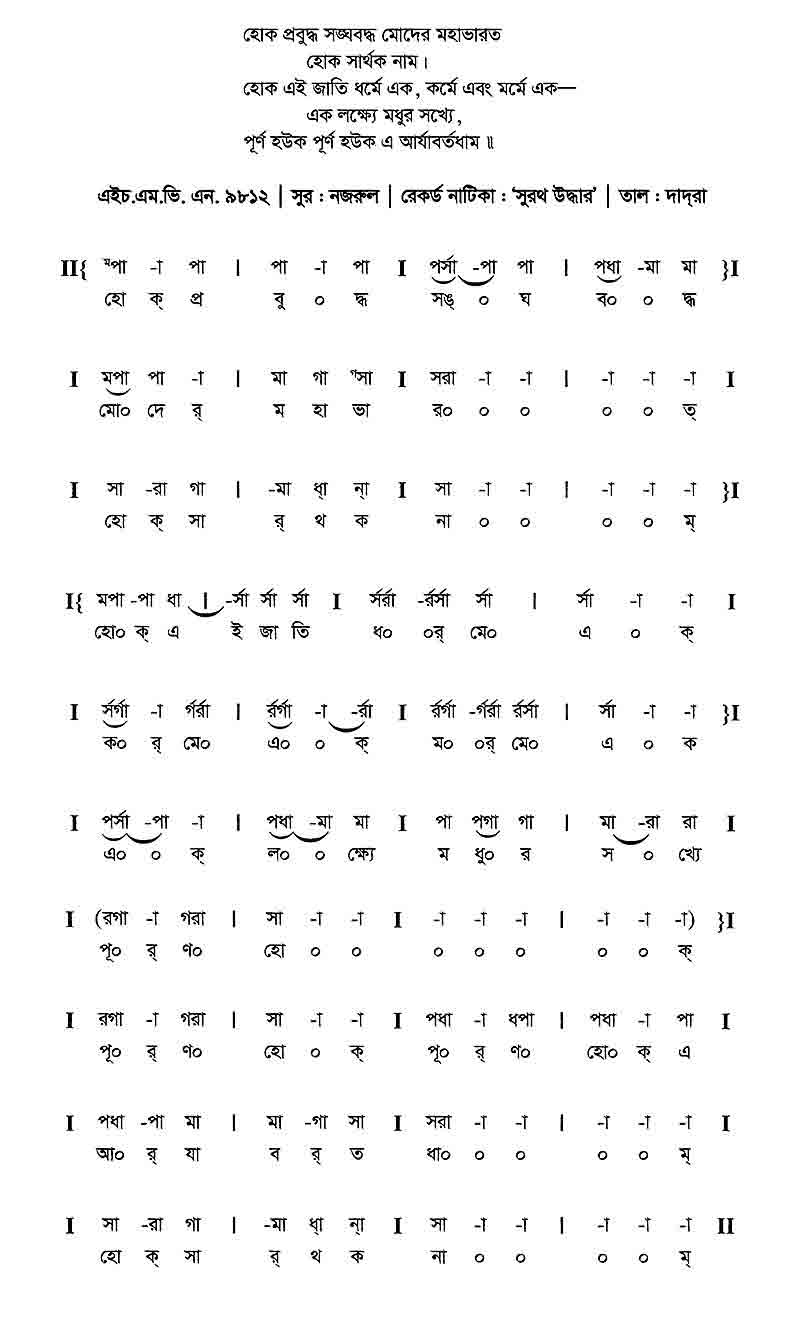 হোক প্রবুদ্ধ সঙ্ঘবন্ধ মোদের মহাভারত হোক সার্থক নাম। হোক এই জাতি ধর্মে এক, কর্মে এক, মর্মে এক — এক লক্ষ্যে মধুর সখ্যে, পূর্ণ হউক পূর্ণ হউক আর্যাবর্তধাম।।