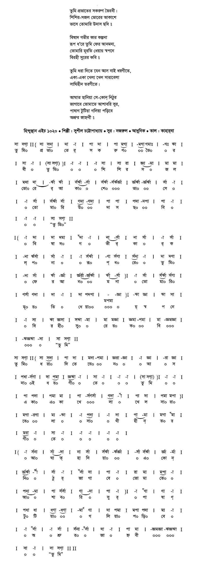 গ্রামের শেষের মাঠের পথে গান গেয়ে কে যায় একা বাউল আনমনা। তার সুরে সবুজ ধানের ক্ষেত্রে ঢেউ খেলিয়া যায় গায় সাথে চপল-ঝরনা।। চলে নূপুর মুখর পায় সুর বাজিয়ে একতারায়, তাথৈ তাথৈ হাততালি দেয় সাথে তালবনা।। শান্ত নদীর কূলে হঠাৎ জোয়ার উঠে দুলে, বালুচরে চম্কে চখা চাহে নয়ন তুলে’। ওঠে রেঙে আকাশ কোল্ লাগে শাখায় শাখায় দোল্ লাগে দোল্, মনের মাঝে এঁকে সে যায় সুরের আল্পনা।।
