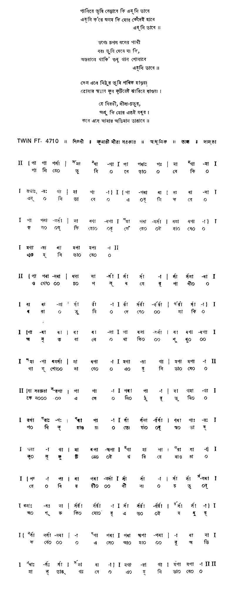 তুমি সুখে থাক প্রিয়া আমি আজ চ’লে যাই। তোমারে চাহিয়া জনমে জনমে এই ব্যথা যেন পাই।। দুদিনের সাথী দু’দিনের লাগি’ এসেছিনু আমি তব অনুরাগী, হৃদয় বাণীতে চেয়েছিনু শুধু আর কিছু চাহি নাই।। আকাশে তব দিয়ে গেনু ফুল কণ্ঠে গানের মালা, হয়তো একদা অন্তরে তব জাগিবে স্মৃতির জ্বালা। হয়তো বা তব নয়নের কোণে নতুনের ছায়া জাগিবে গোপনে, স্মৃতিটি আমার মুছে যাবে জানি তবু কিছু ক্ষতি নাই — এই ব্যথা যেন পাই।।