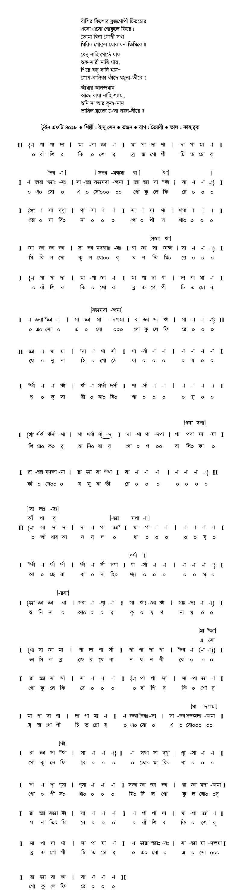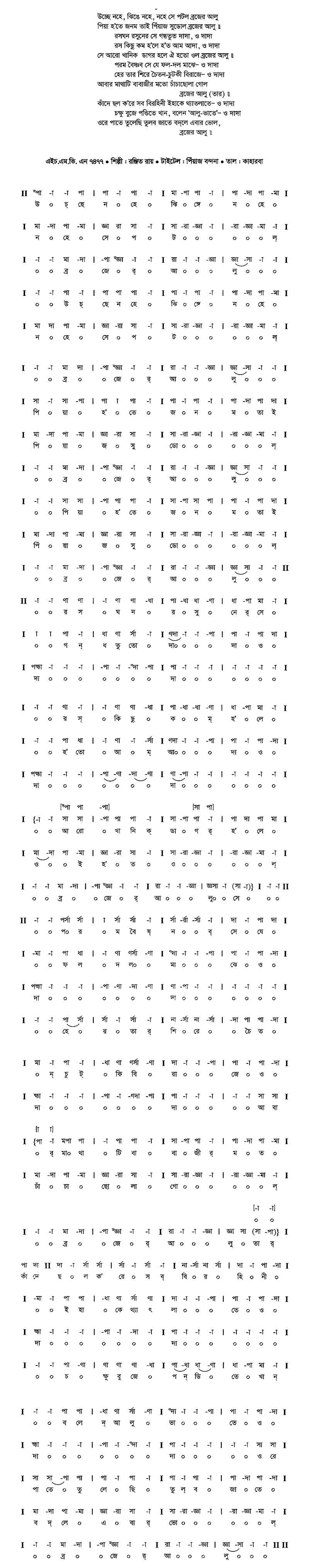 ব্রজপুর-চন্দ্র পরমসুন্দর, কিশোর লীলা-বিলাসী সখি গো, আমি তা’রই চিরদাসী। অমৃত-রস-ঘন শ্যামল শোভন, প্রেম-বৃন্দাবন-বাসী॥ চাঁচর চিকুরে শিখী-পাখা যার, গলে দোলে বন-কুসুম হার ললাটে তিলক, কপোলে অলক অধরে মৃদু মৃদু হাসি॥ মকর কুন্ডল দোলে শ্রবণে, বোলে মণি-মঞ্জরি রাতুল চরণে চির অশান্ত, চপল কান্ত বিশ্ব সে রূপ-পিয়াসি॥ বক্ষে শ্রীবৎস কৌস্তুভ শোভে, করে মুরলী ভোলে মধুর রবে, পীত বসনধারী সেই মাধবে যেন যুগে যুগে ভালবাসি॥