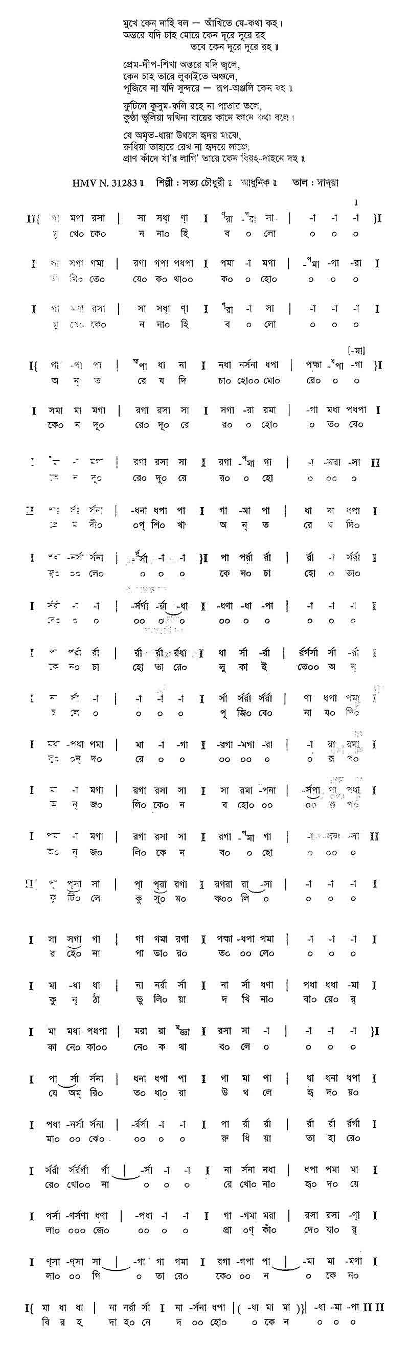 একাদশীর চাঁদ রে ওই রাঙা মেঘের পাশে যেন কাহার ভাঙা কলস আকাশ গাঙে ভাসে।। সেই কলসি হতে ধরার ’পরে অঝোর ধারায় মধু ঝরে রে দলে দলে তাই কি তারার মৌমাছিরা আসে।। সেই মধু পিয়ে ঘুমের নেশায় ঝিমায় নিশীথ রাতি বন-বধূ সেই মধু ধরে ফুলের পাত্র পাতি’। সেই মধু এক বিন্দু পিয়ে সিন্ধু ওঠে ঝিলমিলিয়ে রে সেই চাঁদেরই আধখানা কি তোমার মুখে হাসে।।