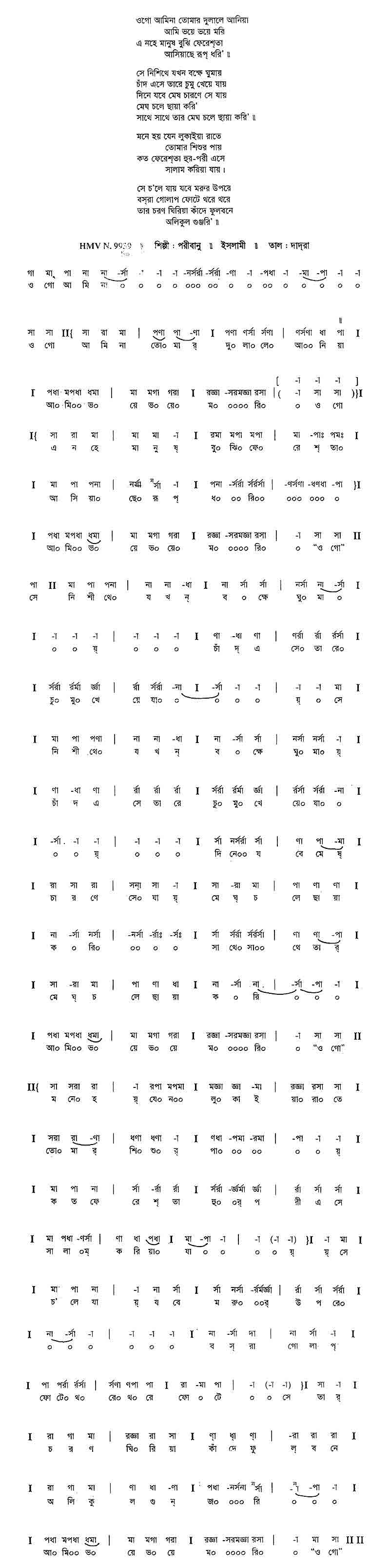 ওগো আমিনা তোমার দুলালে আনিয়া আমি ভয়ে ভয়ে মরি এ নহে মানুষ বুঝি ফেরেশ্তা আসিয়াছে রূপ ধরি’॥ সে নিশীথে যখন বক্ষে ঘুমায় চাঁদ এসে তারে চুমু খেয়ে যায় দিনে যবে মেষ চারণে সে যায় মেঘ চলে ছায়া করি’, সাথে সাথে তার মেঘ চলে ছায়া করি’॥ মনে হয় যেন লুকাইয়া রাতে তোমার শিশুর পায় কত ফেরেশ্তা হুর-পরী এসে সালাম করিয়া যায়॥ সে চলে যায় যবে মরুর উপরে বস্রা গোলাপ ফোটে থরে থরে তার চরণ ঘিরিয়া কাঁদে ফুলবনে অলিকুল গুঞ্জরি’॥