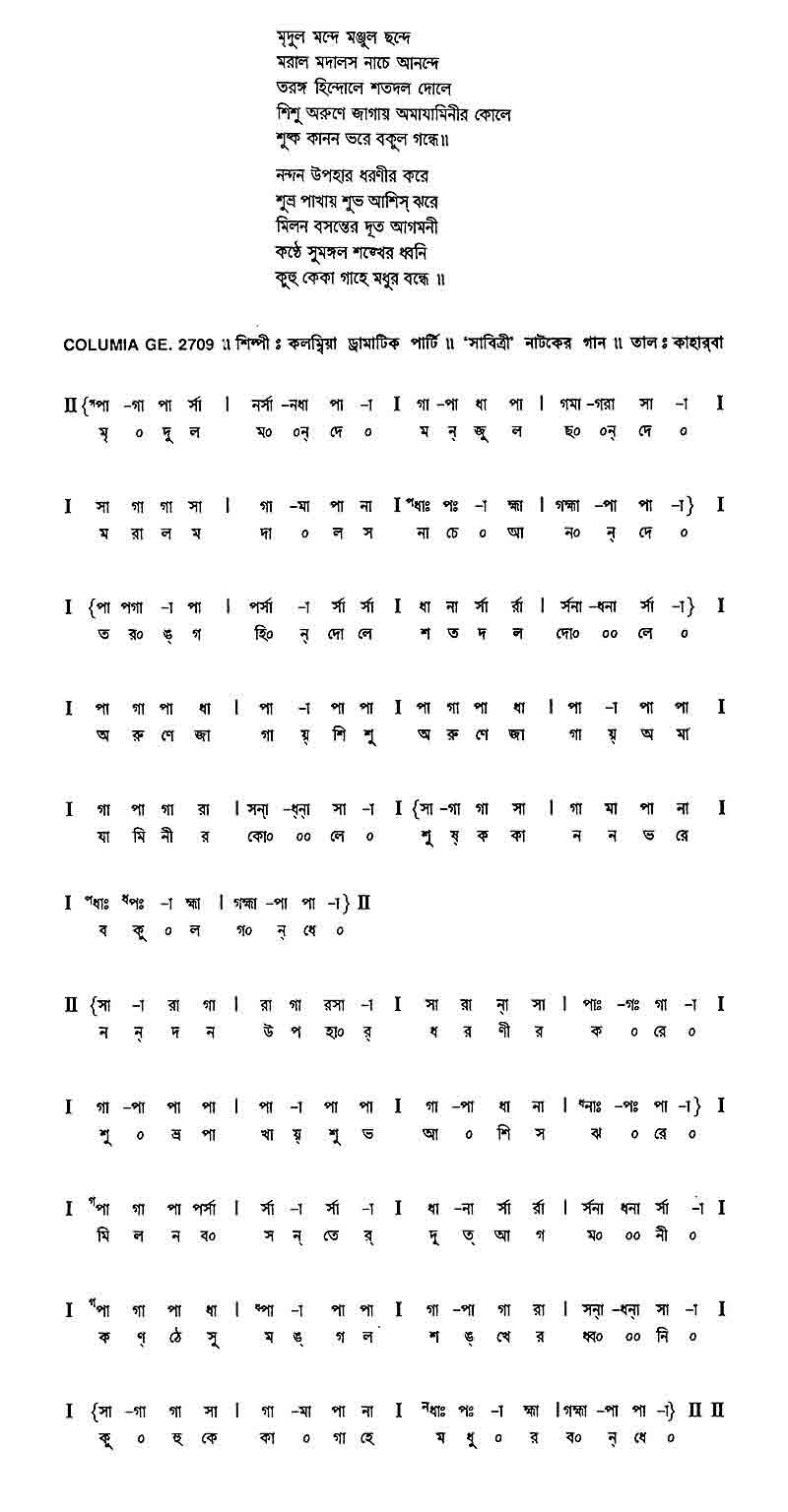 মৃদুল মন্দে মঞ্জুল ছন্দে মরাল মদালস নাচে আনন্দে।। তরঙ্গ হিন্দোলে শতদল দোলে শিশু অরুণে জাগায় অমা-যামিনীর কোলে শুষ্ক কানন ভরে বকুল গন্ধে।। নন্দন-উপহার ধরণীর ক’রে শুভ্র পাখায় শুভ আশিস ঝরে। মিলন, বসন্তের দূত আগমনী কণ্ঠে সুমঙ্গল শঙ্খের ধ্বনি কুহু কেকা গাহে মধুর ছন্দে।।