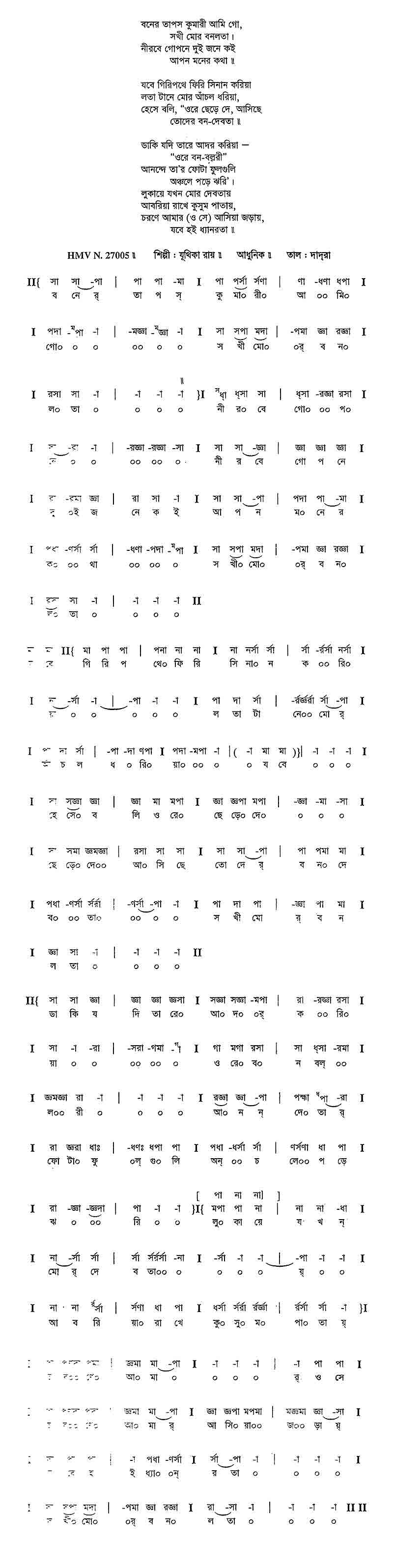 বনের তাপস কুমারী আমি গো, সখি মোর বনলতা। নীরবে গোপনে দুইজনে কই আপন মনের কথা।। যবে গিরিপথে ফিরি সিনান করিয়া, লতা টানে মোর আঁচল ধরিয়া, হেসে বলি, ওরে ছেড়ে দে, আসিছে তোদের বন-দেবতা।। ডাকি যদি তারে আদর করিয়া — ওরে বন বল্লরি, আনন্দে তার ফোটা ফুলগুলি অঞ্চলে পড়ে ঝরি'। লুকায়ে যখন মোর দেবতায় আবরিয়া রাখে কুসুমে পাতায়, চরণে আমার (ও সে) আসিয়া জড়ায় যবে হই ধ্যানরতা।।