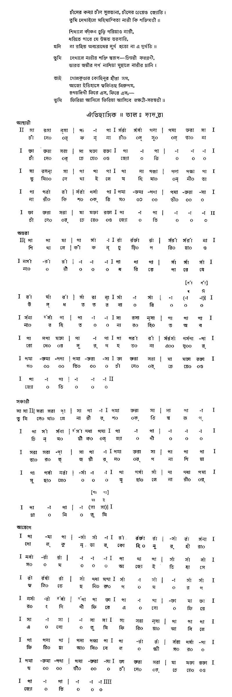 চাঁদের কন্যা চাঁদ সুলতানা, চাঁদের চেয়েও জ্যোতি। তুমি দেখাইলে মহিমান্বিতা নারী কী শক্তিমতী।। শিখালে কাঁকন চুড়ি পরিয়াও নারী, ধরিতে পারে যে উদ্ধত তরবারি, না রহিত অবরোধের দুর্গ, হতো না এ দুর্গতি।। তুমি দেখালে নারীর শক্তি স্বরূপ – চিন্ময়ী কল্যাণী, ভারত জয়ীর দর্প নাশিয়া মুছালে নারীর গ্লানি। তুমি গোলকুন্ডার কোহিনূর হীরা সম আজো ইতিহাসে জ্বলিতেছে নিরুপম, রণরঙ্গিণী ফিরে এসো, তুমি ফিরিয়া আসিলে, ফিরিয়া আসিবে লক্ষী ও সরস্বতী।।