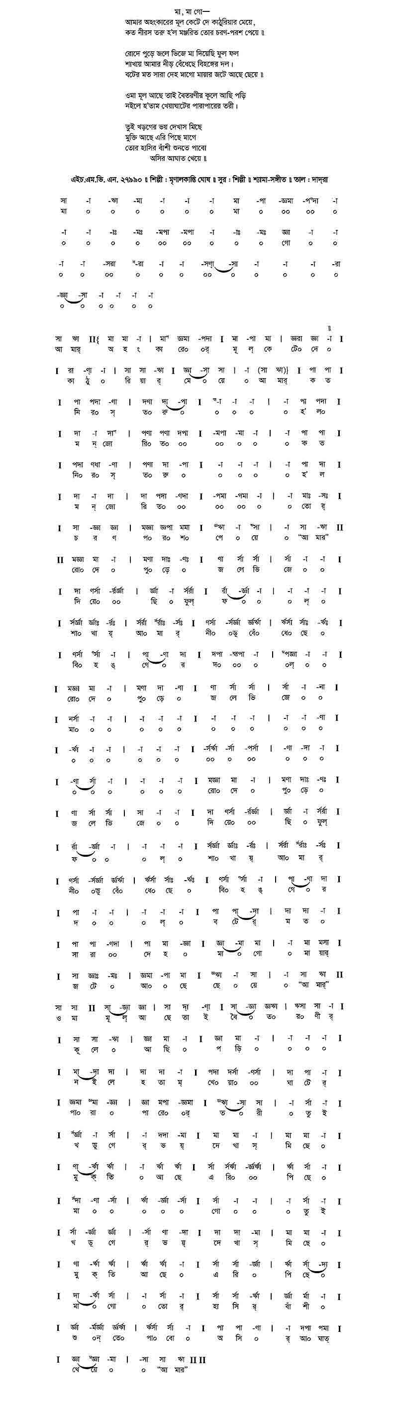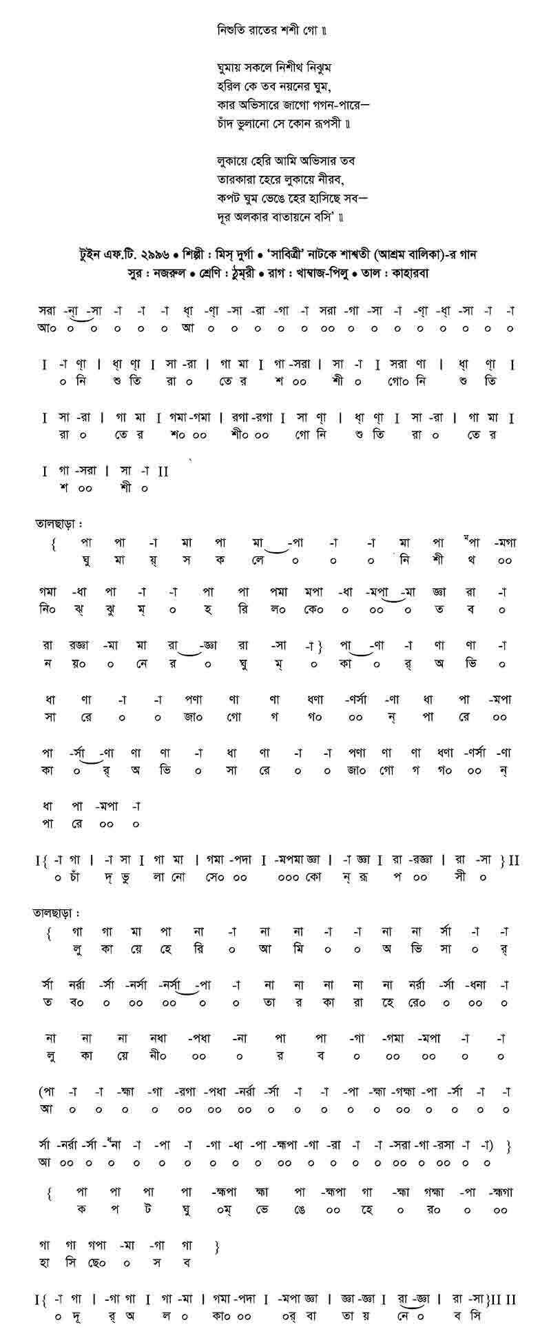 নিশুতি রাতের শশী গো। ঘুমায় সকলে নিশীথ নিঝুম হরিল কে নয়নেরই ঘুম, কার অভিসারে জাগো গগন-পারে — চাঁদ ভুলানো সে-কোন্ রূপসী।। লুকায়ে হেরি আমি অভিসার তব তারকারা হেরে লুকায়ে নীরব, কপট ঘুম ভেঙে হের হাসিছে সব — দূর অলকার বাতায়নে বসি’।।