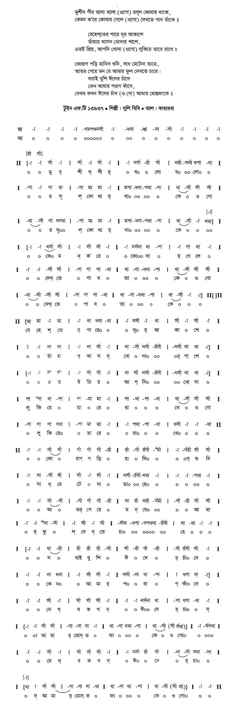 ওগো মুর্শিদ পীর! বলো বলো রসুল কোথায় থাকে। কোথায় গেলে কেমন ক’রে দেখতে পাব তাঁকে।। বেহেশ্ত — ’পারে দূর আকাশে তাঁহার আসন খোদার পাশে, সে এতই প্রিয়, আপনি খোদা লুকিয়ে তারে রাখে।। কোরান পড়ি হাদিস শুনি, সাধ মেটে না তাহে, আতর পেয়ে মন যে আমার ফুল দেখতে চাহে। সবাই খুশি ঈদের চাঁদে আমার কেন পরান কাঁদে, দেখ্ব কখন আমার ঈদের চাঁদ — মোস্তফাকে।।