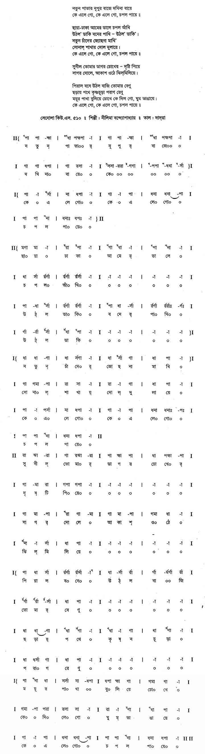 নতুন পাতার নূপুর বাজে দখিনা বায়ে কে এলে গো, কে এলে গো চপল পায়ে।। ছায়া-ঢাকা আমের ডালে চপল আঁখি উঠ্ল ডাকি' বনের পাখি — উঠ্ল ডাকি'। নতুন চাঁদের জোছনা মাখি সোনাল শাখায় দোল দুলায়ে কে এলে গো, কে এলে গো চপল পায়ে।। সুনীল তোমার ডাগর চোখের দৃষ্টি পিয়ে সাগর দোলে, আকাশ ওঠে ঝিল্মিলিয়ে। পিয়াল বনে উঠল বাজি তোমার বেণু ছড়ায় পথে কৃষ্ণচূড়া পরাগ-রেণু। ময়ূর-পাখা বুলিয়ে চোখে কে দিলে গো ঘুম ভাঙায়ে। কে এলে গো চপল পায়ে।।