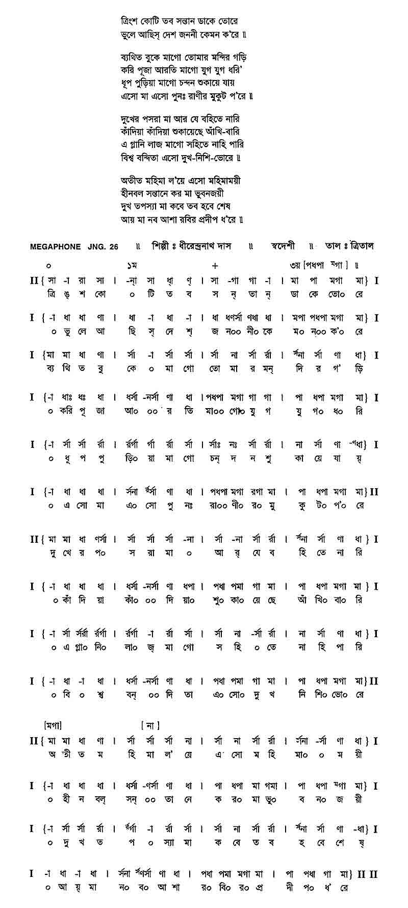 ত্রিংশ কোটি তব সন্তান ডাকে তোরে ভুলে আছিস দেশ জননী কেমন ক’রে॥ ব্যথিত বুকে মাগো তোমার মন্দির গড়ি করি পূজা আরতি মাগো যুগ যুগ ধরি’ ধূপ পুড়িয়া মাগো চন্দন শুকায়ে যায় এসো মা এসো পুন রানীর মুকুট প’রে॥ দুঃখের পসরা মা আর যে বহিতে নারি কাঁদিয়া কাঁদিয়া শুকায়েছে আঁখি-বারি এ গ্লানি লাজ মাগো সহিতে নাহি পারি বিশ্ব বন্দিতা এসো দুখ-নিশি-ভোরে॥ অতীত মহিমা ল’য়ে এসো মহিমাময়ী হীনবল সন্তানে কর মা ভুবনজয়ী দুখ তপস্যা মা কবে তব হবে শেষ আয় মা নব আশা রবির প্রদীপ ধ’রে॥