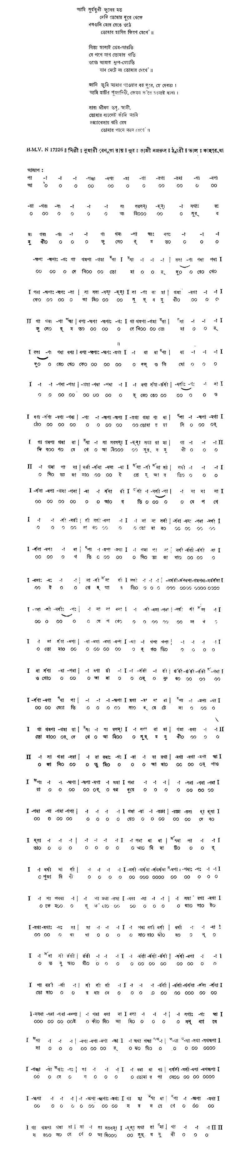 কালো মেয়ের পায়ের তলায় দেখে যা আলোর নাচন। (তার) রূপ দেখে দেয় বুক পেতে শিব যার হাতে মরণ বাঁচন।। কালো মায়ের আঁধার কোলে শিশু রবি শশী দোলে (মায়ের) একটুখানি রূপের ঝলক স্নিগ্ধ বিরাট নীল–গগন।। পাগলী মেয়ে এলোকেশী নিশীথিনীর দুলিয়ে কেশ নেচে বেড়ায় দিনের চিতায় লীলার রে তার নাই কো শেষ। সিন্ধুতে মা’র বিন্দুখানিক ঠিকরে পড়ে রূপের মানিক বিশ্বে মায়ের রূপ ধরে না মা আমার তাই দিগ্–বসন।।