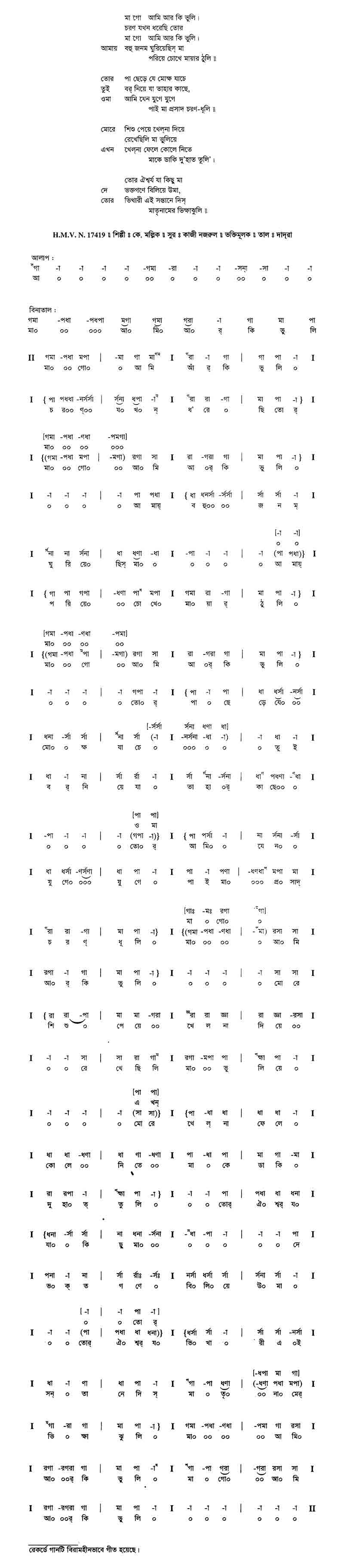 মা আমি আর কি ভুলি মাগো আমি আর কি ভুলি। চরণ যখন ধরেছি তোর মাগো আমি আর কি ভুলি। আমায় বহু জনম ঘুরিয়েছিস্ মা পরিয়ে চোখে মায়ার ঠুলি॥ তোর পা ছেড়ে যে মোক্ষ যাচে, তুই বর্ নিয়ে যা তাহার কাছে ওমা আমি যেন যুগে যুগে পাই মা প্রসাদ চরণ-ধূলি॥ মোরে শিশু পেয়ে খেল্না দিয়ে, রেখেছিলি মা ভুলিয়ে এখন খেল্না ফেলে কোলে নিতে মাকে ডাকি দু’হাত তুলি। তোর ঐশ্বর্য যা কিছু মা দে ভক্তগণে বিলিয়ে উমা, তোর ভিখারি এই সন্তানে দিস্ মাতৃনামের ভিক্ষাঝুলি॥