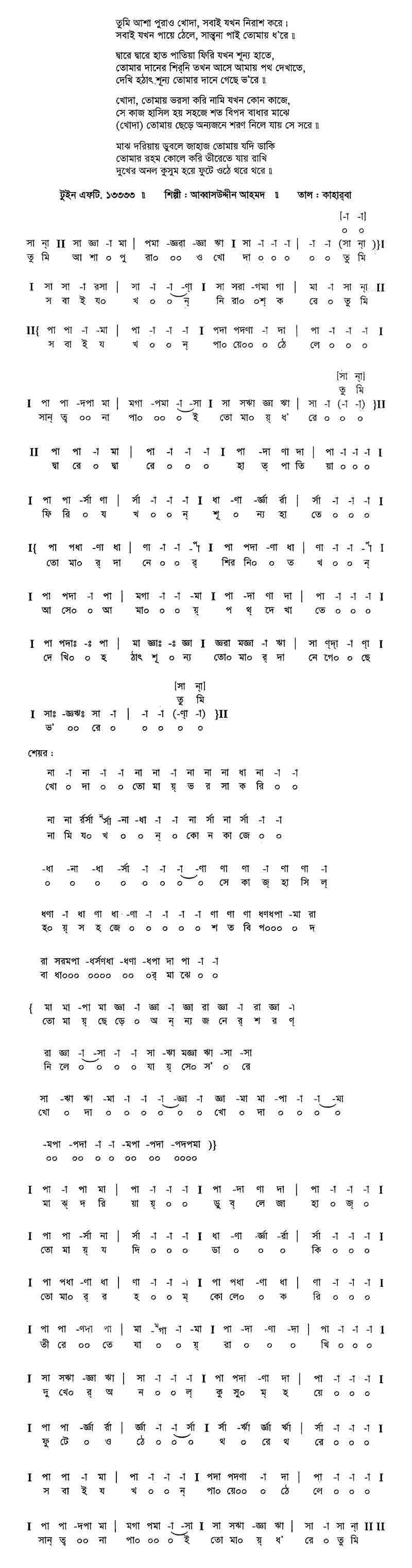 তুমি আশা পুরাও খোদা, সবাই যখন নিরাশ করে। সবাই যখন পায়ে ঠেলে, সান্ত্বনা পাই তোমায় ধ'রে।। দ্বারে দ্বারে হাত পাতিয়া ফিরি যখন শূন্য হাতে, তোমার দানের শির্নি তখন আসে আমায় পথ দেখাতে, দেখি হঠাৎ শূন্য তোমার দানে গেছে ভ'রে।। খোদা, তোমায় ভরসা করি' নামি যখন কোন কাজে, সে কাজ হাসিল হয় সহজে শত বিপদ বাধার মাঝে (খোদা) তোমায় ছেড়ে অন্য জনে শরণ নিলে যায় সে সরে।। মাঝ দরিয়ায় ডুবলে জাহাজ তোমায় যদি ডাকি তোমার রহম কোলে করি তীরেতে যায় রাখি দুখের অনল কুসুম হয়ে ফুটে ওঠে থরে থরে।।