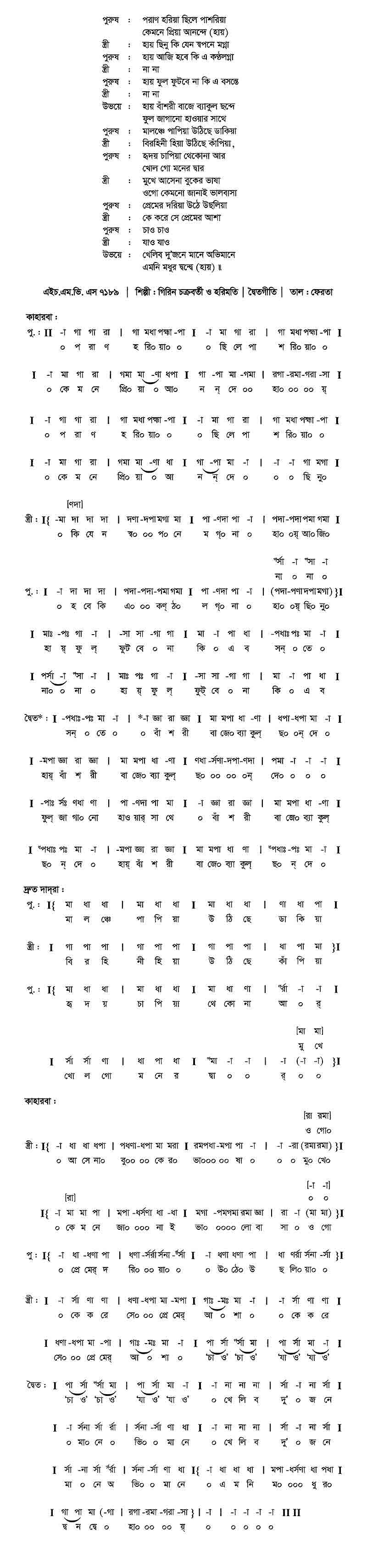 পুরুষ 	: 	পরান হরিয়া ছিলে পাশরিয়া