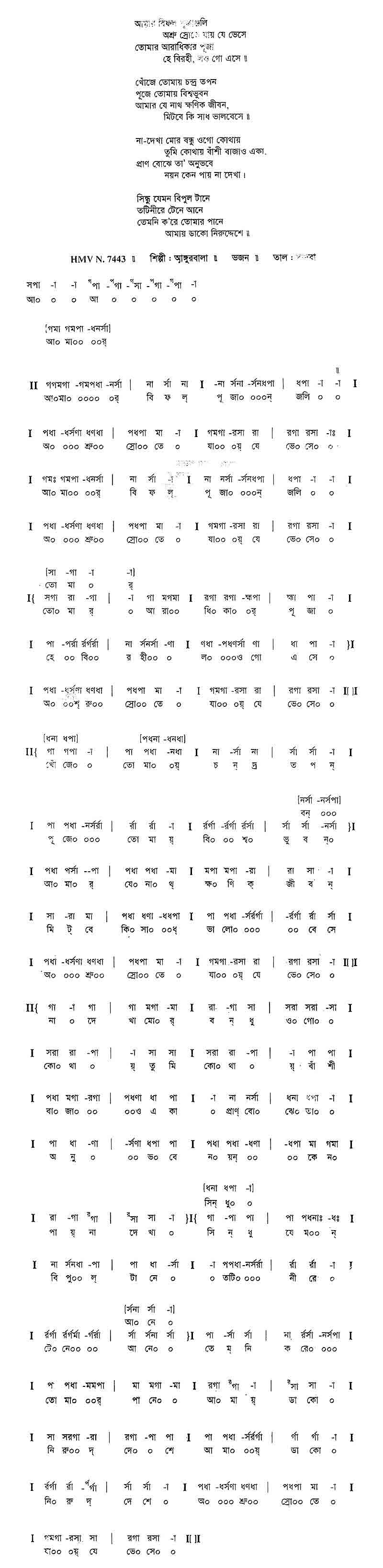 আমার বিফল পূজাঞ্জলি অশ্রু-স্রোতে যায় যে ভেসে তোমার আরাধিকার পূজা হে বিরহী, লও হে এসে॥ খোঁজে তোমায় চন্দ্র তপন পূজে তোমায় বিশ্বভুবন, আমার যে নাথ ক্ষণিক জীবন মিটবে কি সাধ ভালবেসে॥ না দেখা মোর, বন্ধু ওগো কোথায়, তুমি কোথায়, বাঁশি বাজাও একা, প্রাণ বোঝে তা অনুভবে নয়ন কেন পায় না দেখা। সিন্ধু যেমন বিপুল টানে তটিনীরে টেনে আনে, তেমনি করে তোমার পানে আমায় ডাকো নিরুদ্দেশে॥