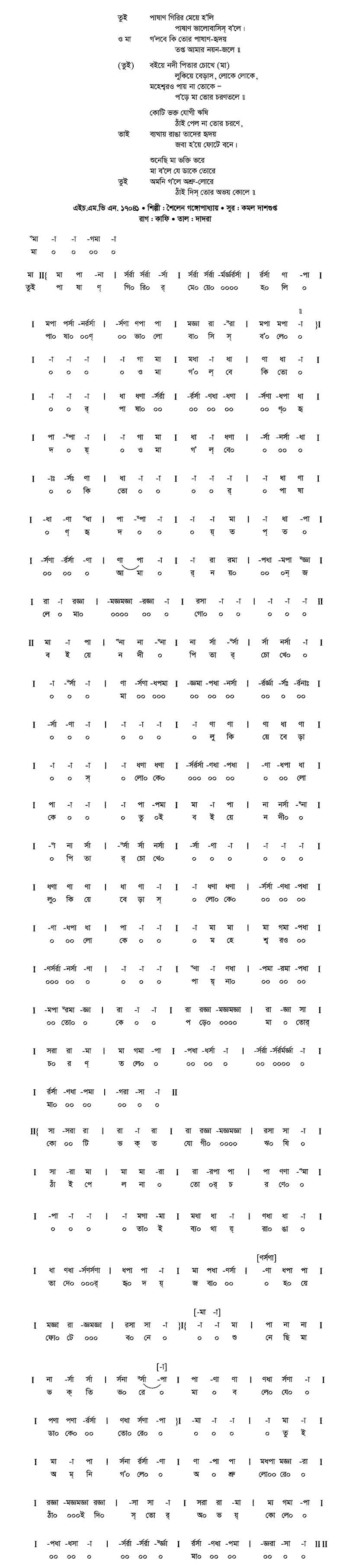তুই পাষাণ গিরির মেয়ে হ’লি পাষাণ ভালোবাসিস্ ব’লে। মা গ’লবে কি তোর পাষাণ-হৃদয় তপ্ত আমার নয়ন-জলে।। তুই বইয়ে নদী পিতার চোখে লুকিয়ে বেড়াস লোকে লোকে মহেশ্বরও পায় না তোকে প’ড়ে মা তোর চরণতলে।। কোটি ভক্ত যোগী ঋষি ঠাঁই পেল না তোর চরণে, তাই ব্যথায়-রাঙা তা’দের হৃদয় জবা হ’য়ে ফোটে বনে। আমি শুনেছি মা ভক্তি ভরে মা ব’লে যে ডাকে তোরে (তুই) অমনি গ’লে অশ্রু-লোরে ঠাঁই দিস তোর অভয় কোলে।।