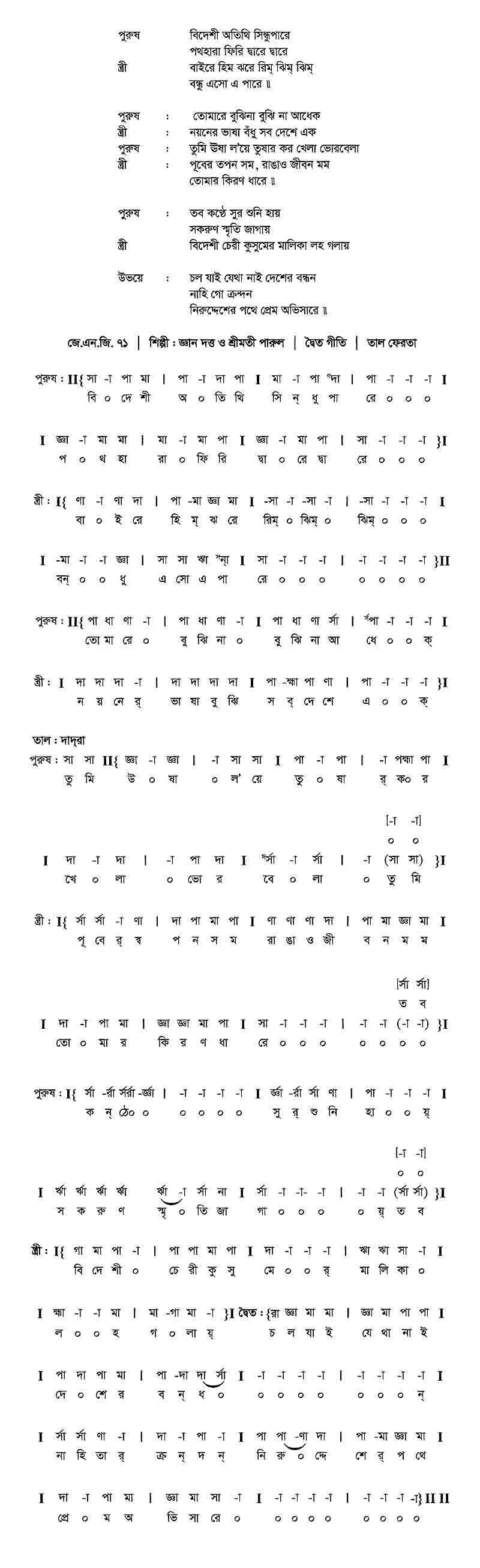 পুরুষ 	: 	বিদেশি অতিথি সিন্ধু পারে পথহারা ফিরি দ্বারে দ্বারে।