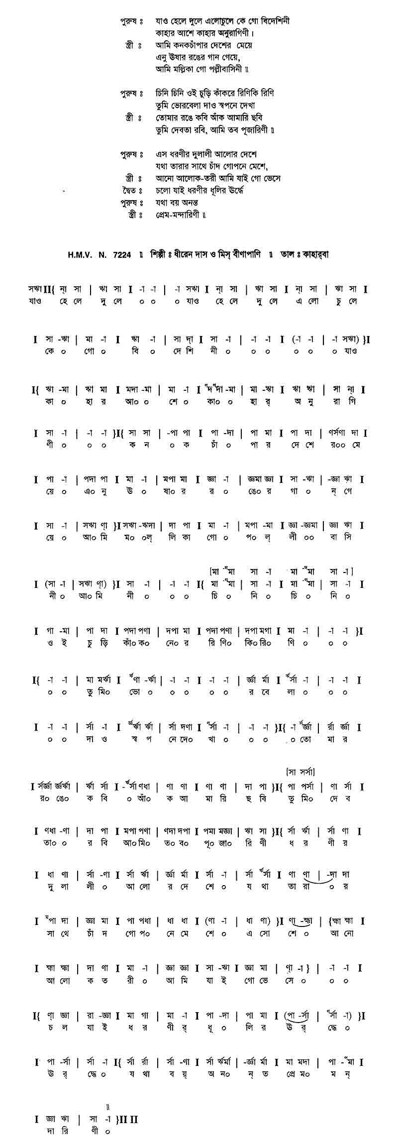 পুরুষ	:	যাও হেলে দুলে এলোচুলে কে গো বিদেশিনী