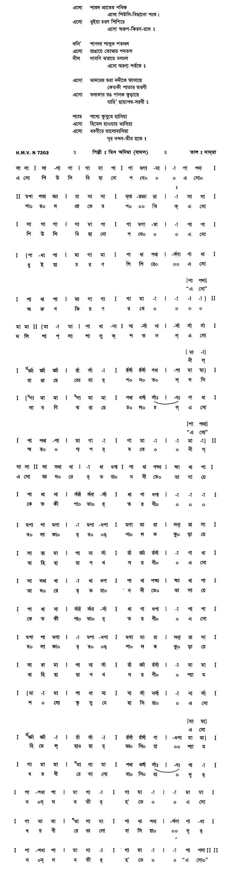 এসো শারদ প্রাতের পথিক এসো শিউলি বিছানো পথে। এসো ধুইয়া চরণ শিশিরে এসো অরুণ-কিরণ-রথে।। দলি, শাপলা শালুক শতদল এসো রাঙায়ে তোমার পদতল নীল লাবনি ঝরায়ে চলচল এসো অরণ্য পর্বতে।। এসো ভাদরের ভরা নদীতে ভাসায়েকেতকী পাতার তরণী এসো বলাকার রঙ পালক কুড়ায়ে বাহি’ ছায়াপথ-সরণি। শ্যাম শস্যে কুসুমে হাসিয়া এসো হিমেল হাওয়ায় ভাসিয়া এসো ধরনীরে ভালোবাসিয়া দুর নন্দন-তীর হতে।।