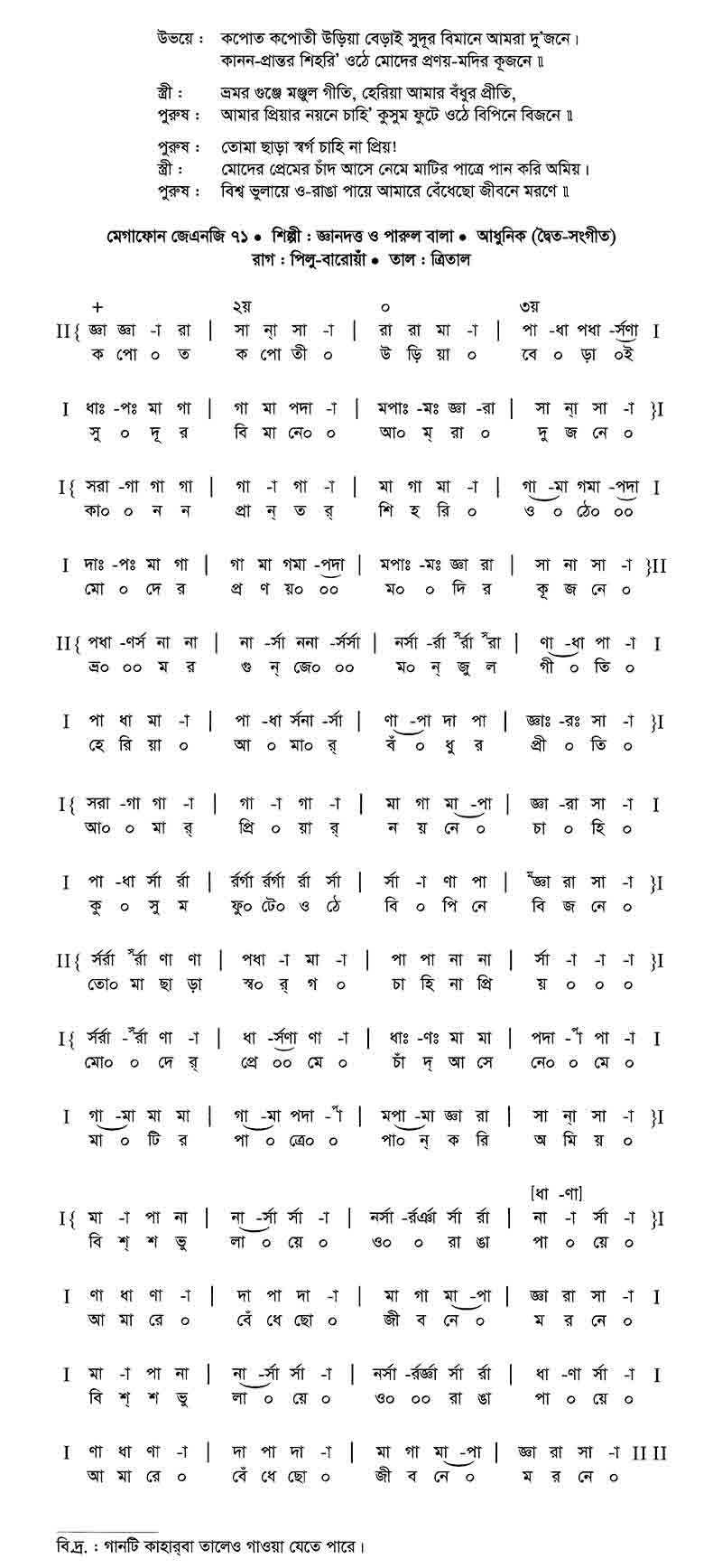 স্ত্রী 	:	ভ্রমর গুঞ্জে মঞ্জুল গীতি, হেরিয়া আমার বঁধূর প্রীতি,