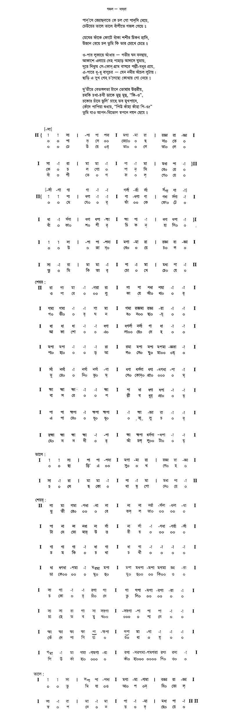 পান্‌সে জোছ্‌নাতে কে			চল গো পানসি বেয়ে’।