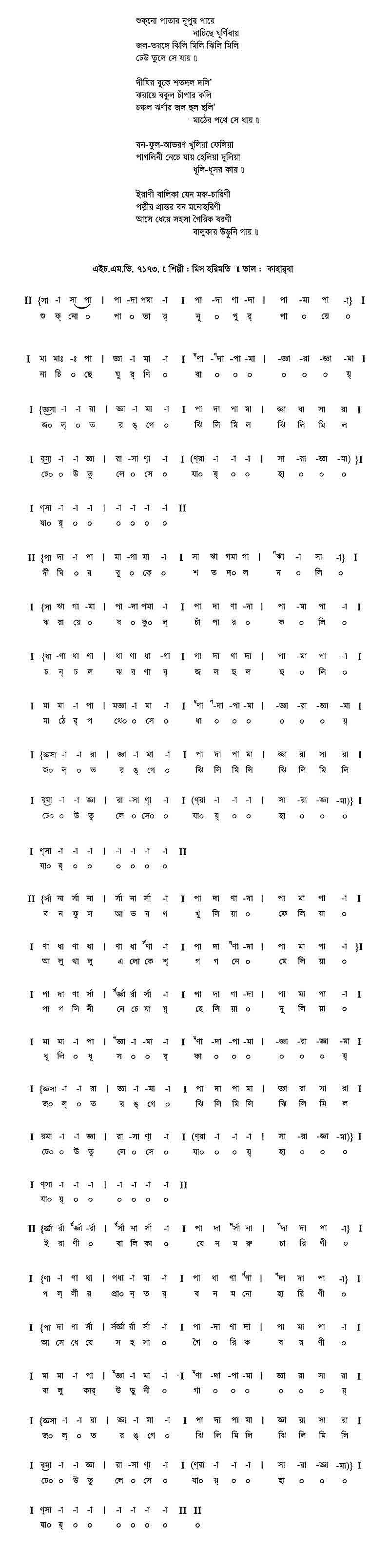 শুকনো পাতার নূপুর পায়ে নাচিছে ঘুর্ণিবায় জল তরঙ্গে ঝিল্মিল্ ঝিল্মিল্ ঢেউ তুলে সে যায়।। দীঘির বুকে শতদল দলি’ ঝরায়ে বকুল–চাঁপার কলি চঞ্চল ঝরনার জল ছল ছলি মাঠের পথে সে ধায়।। বন–ফুল আভরণ খুলিয়া ফেলিয়া আলুথালু এলোকেশ গগনে মেলিয়া পাগলিনী নেচে যায় হেলিয়া দুলিয়া ধূলি–ধূসর কায়।। ইরানি বালিকা যেন মরু–চারিণী পল্লীর–প্রান্তর–বনমনোহারিণী আসে ধেয়ে সহসা গৈরিক বরণী বালুকার উড়্নি গায়।।